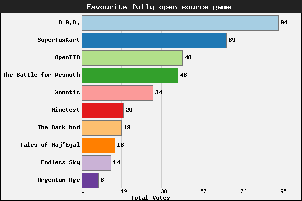 First up, let's take a look at what the current Favourite fully open source game is: 0 A.D. is the winner!