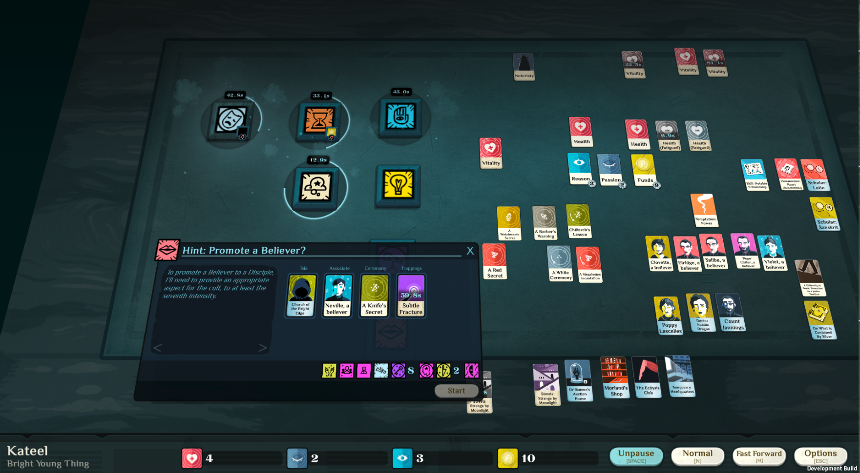 In the screenshot above, it took me literally hours of head scratching and multiple subsequent plays to realise that a Believer has to be promoted using the same Aspect that you used to create your Cult. In that example, my cult, the “Church of the Bright Edge” is built on “Knife” Aspect, and I only have two of those present. My eight “Knock” Aspect points are utterly useless. With later familiarity, this becomes more obvious, but in the early game, it will have you climbing the walls.