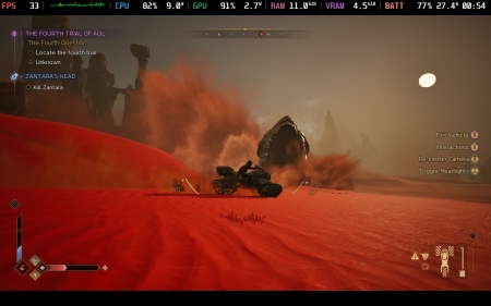 The Desktop Linux testing was done on Kubuntu 25.04: AMD Ryzen 5800x, Radeon 6800 XT and 2560x1440. With most settings either on High or Ultra, with XeSS upscaling on Ultra Quality and FSR Frame Generation turned on.