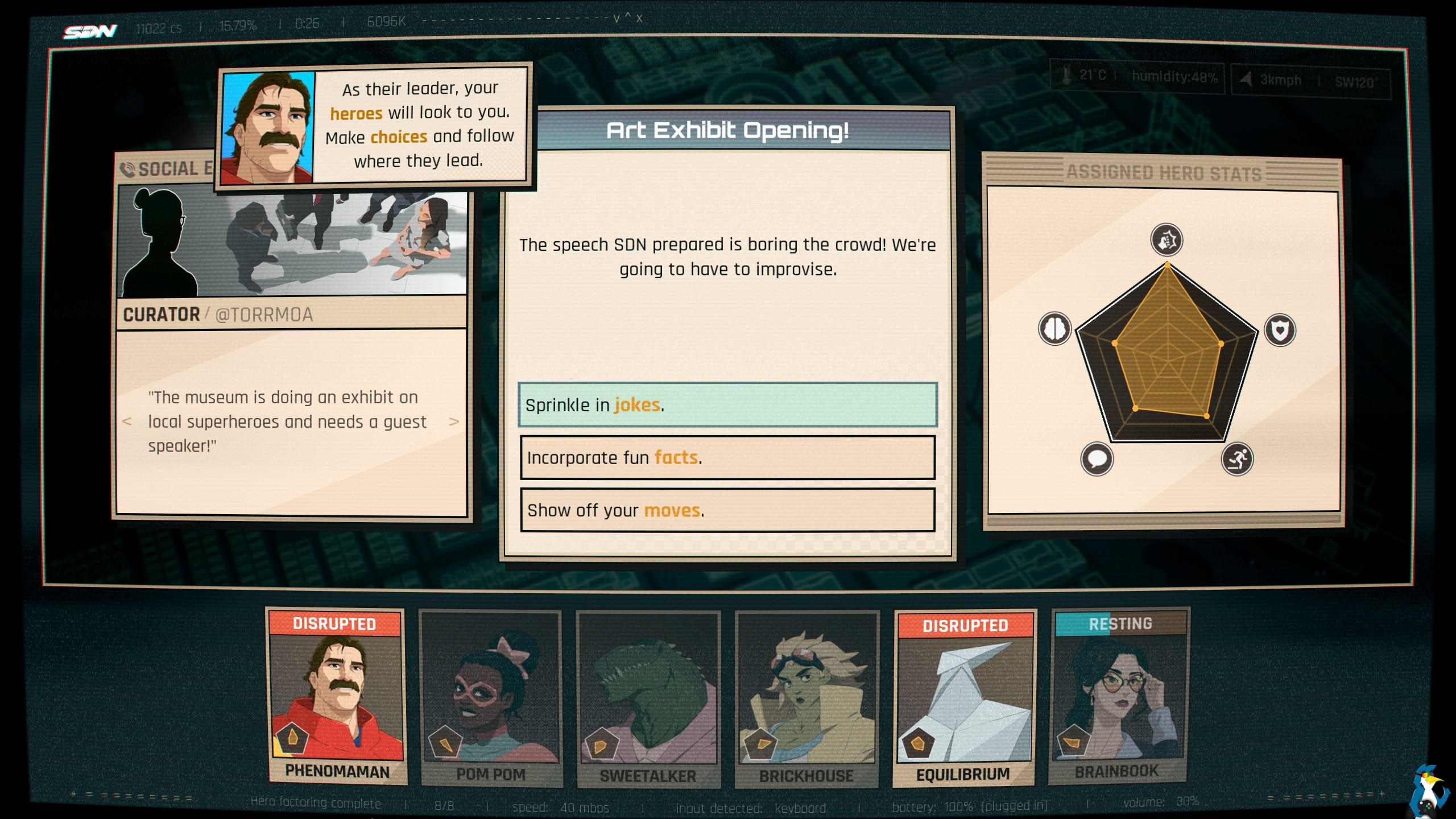 What you get is a mixture of two rather different games. An interactive movie-like experience, blended with a choice-based management sim. In between all the animations, you'll be doing the actual work as a dispatching agent, choosing what heroes to send to each situation. Each of them have their own strengths and weaknesses, and you have to match them up to each problem as best you can. It also sprinkles in little mini-events, where you make more choices on how to handle each situation. I failed a few bits here and there, but it is easy enough to understand and thanks to all the chatter from the heroes, it keeps it really engaging. Still, it's quite odd to jump from full animations into a top-down management sim.