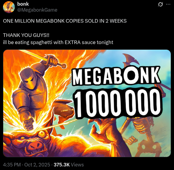 Clearly, they were a little insane. Then again, so is every game developer. Nothing is a guaranteed success, it doesn't matter if you're a huge publisher or a solo developer, sometimes it's just pure luck. In this case, they were just onto something great. As the developer posted on X, in two weeks they've made a million sales.