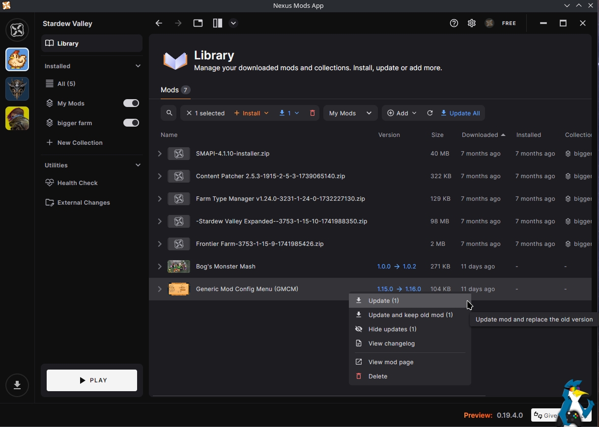 The latest update v0.19.4 brings in new context menus (pictured below) to make interacting with mods easier, and there's also support for Stardew Valley FOMOD installers baked into the app now too.