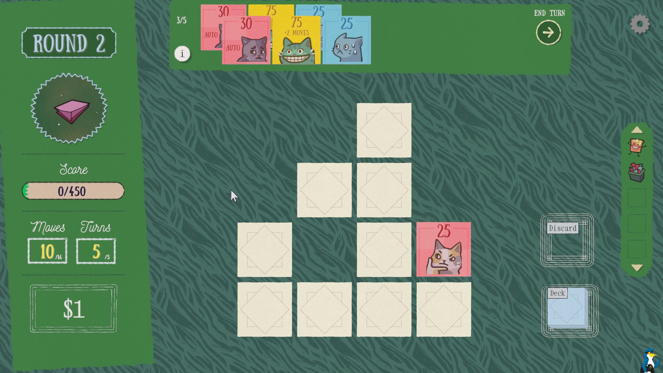 Much like the inspiration, you go through rounds to build up a score and you need to keep hitting a higher score to continue on. Here it's definitely challenging, especially because my short-term memory is apparently awful. During your run you earn money to spend on new cards in the shop to add to your deck like cards that give you bonus moves or matching any other card. You also get to buy up special curios which allow you to tweak your whole run with bonuses like multiplying your score or money.