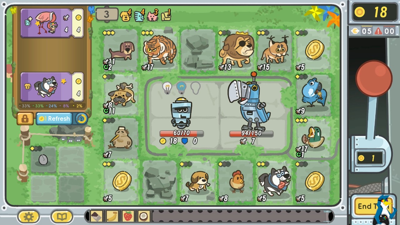 Each time you end the turn not only does the enemy attack, but the board evolves too with new animals added to it. As at the start of a run, most of the board is covered in rocks. The deck-building comes in here, as you have a shop to spend some of your coins to upgrade or swap the animals around. When you defeat an enemy, the game progresses onto the next but the board stays with you for you to keep upgrading.