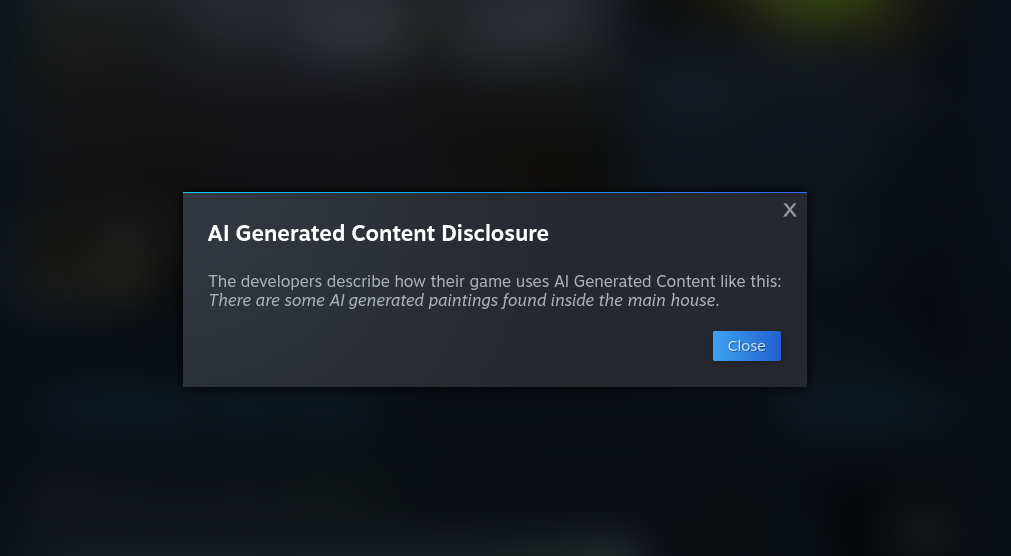 I love how simple and most importantly how effective it is. The important thing is that doesn't stop you doing anything, or taking a look - it just makes sure you're fully aware of the AI gen use. Hopefully never again will I completely waste my time playing through a game, writing it up and then suddenly remembering - "Oh yeah, I have to check if they stuck AI generation in it".