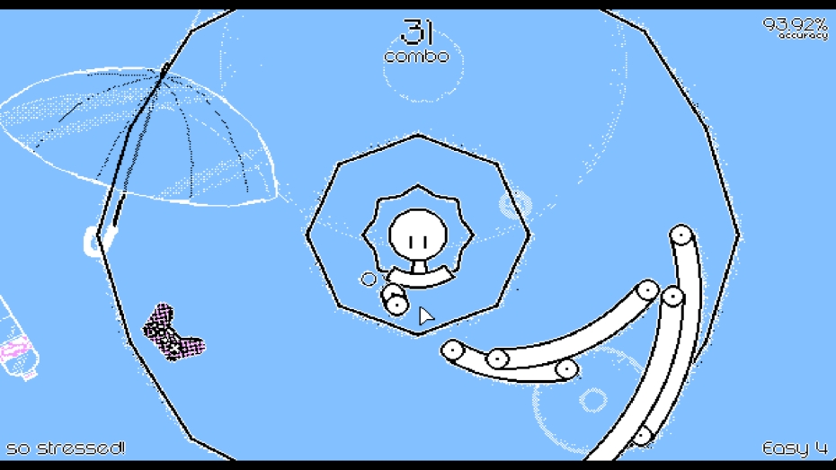 Every song literally revolves around you, and so you have to keep up with it. You're in the middle, controlling a little face with a paddle that you rotate around you to catch blocks in time with the clicks from the tunes.