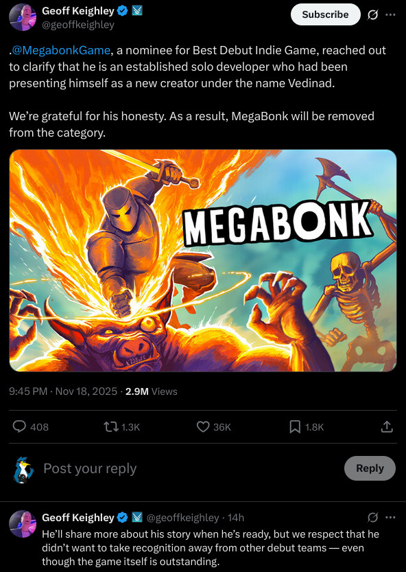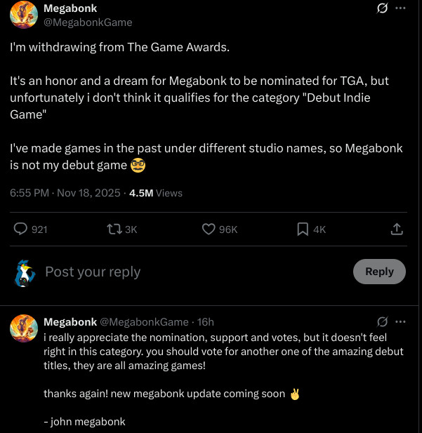 While I applaud their honesty, and their attempt to address it like this, it does shine a light on the Debut category as a whole that feels like Megabonk could have been kept in. Since, other games in the category are from studios that have plenty of veterans. Like how Dispatch from AdHoc Studio was formed by former devs of the likes of Telltale Games and Ubisoft, same again with Sandfall Interactive who has veterans from Ubisoft and other studios.