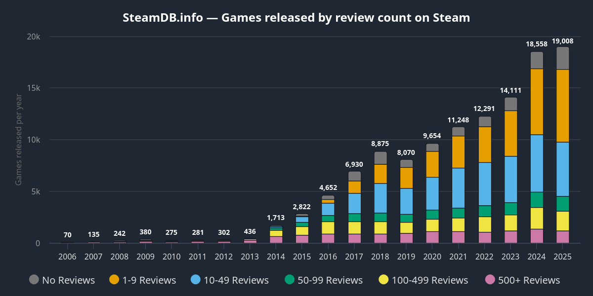 Over 19,000 games have released on Steam in 2025, with nearly half seeing fewer than 10 reviews