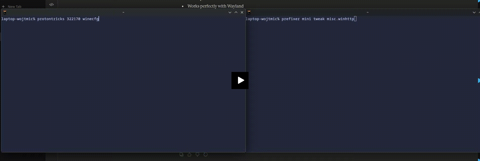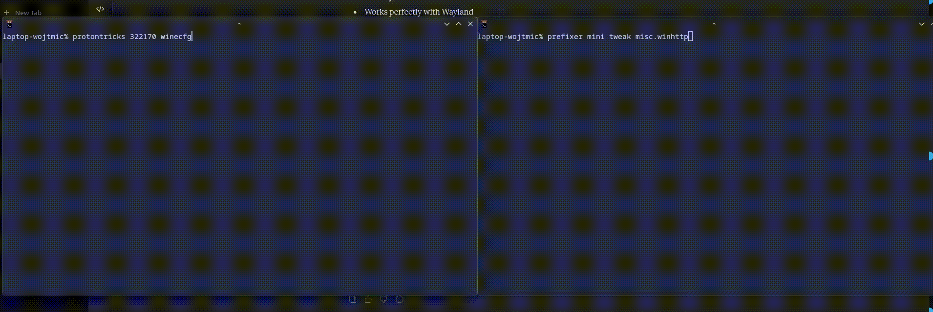 There's also a GIF comparison on the speed and ease of use difference between Protontricks (left) and Prefixer (right):