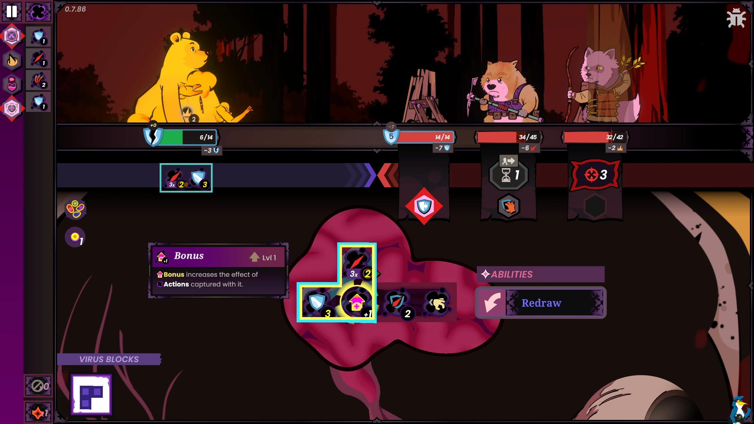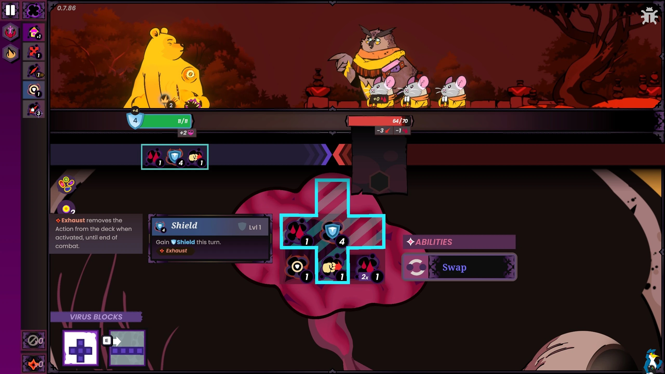 Through repeated runs you can unlock new types of viruses which act as the overall class, and inside each virus are different strains to unlock too with different abilities so there's a nice bit of variety on how you can play through each run once you've unlocked more of it. But even with just the starter virus, there's still a whole lot of mechanics at play. Especially with the perks system, which is like a relic system from deck-builders giving you some special bonuses through the run.