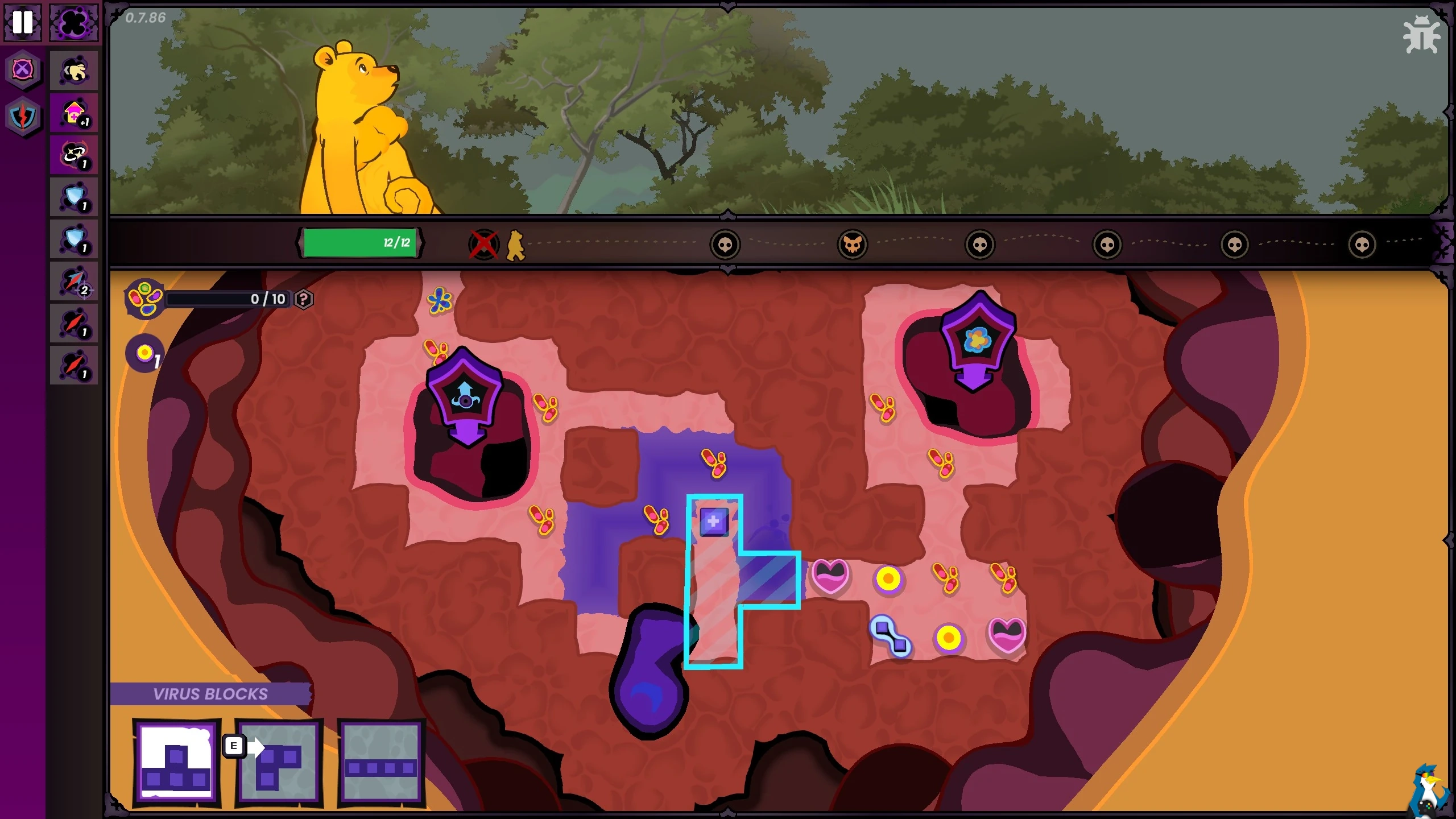 • Explore cellular worlds with tetromino-like block shapes - No roguelite node maps, explore by spreading a virus through the body of your host.