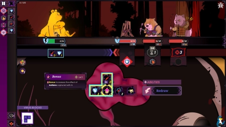 Winnie is always on the move through the forest, and eventually you get put into combat encounters when you come across other animals wandering around. You usually get a choice between three different encounters, each with their own set of enemies to fight and consume with different resources as rewards.