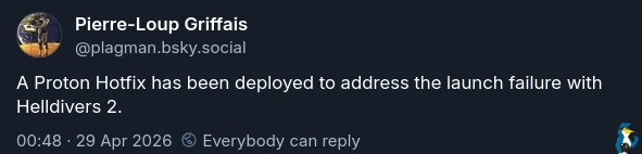 We've seen this type of thing so many times - but Valve again to the rescue. Developer Pierre-Loup Griffais posted on Bluesky to note: "A Proton Hotfix has been deployed to address the launch failure with Helldivers 2".