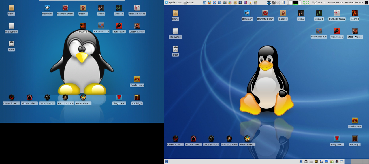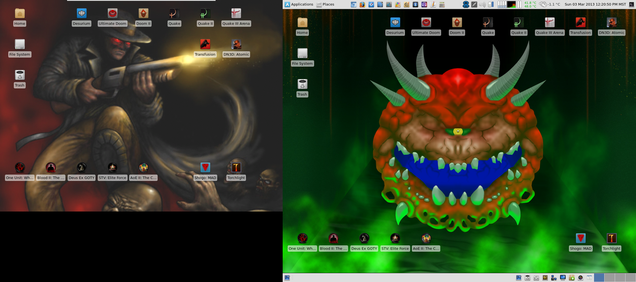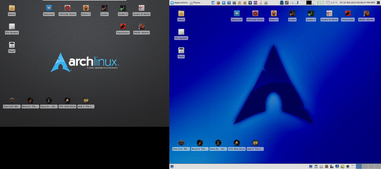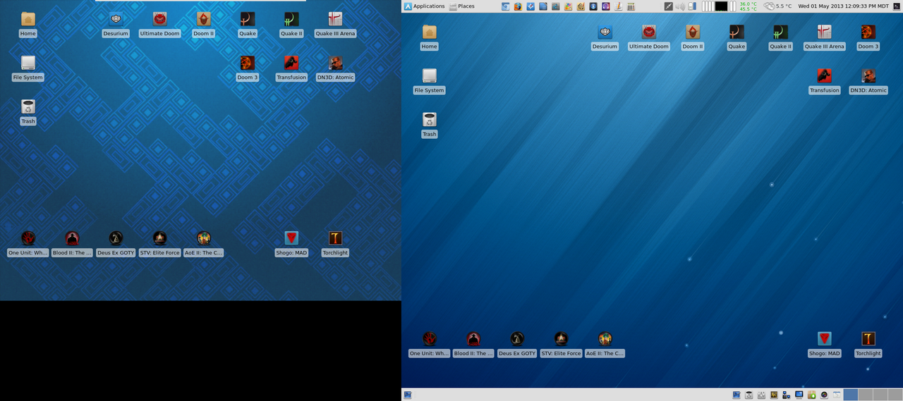 Other changes include some new launchers and my Blood games getting new icons. Titles I have grabbed through the AUR are on the top of the screen, games I am running through Dosbox or WINE at the bottom left, and other commercial native titles are on the bottom right. Any games I have installed through Desura I launch through it's client.